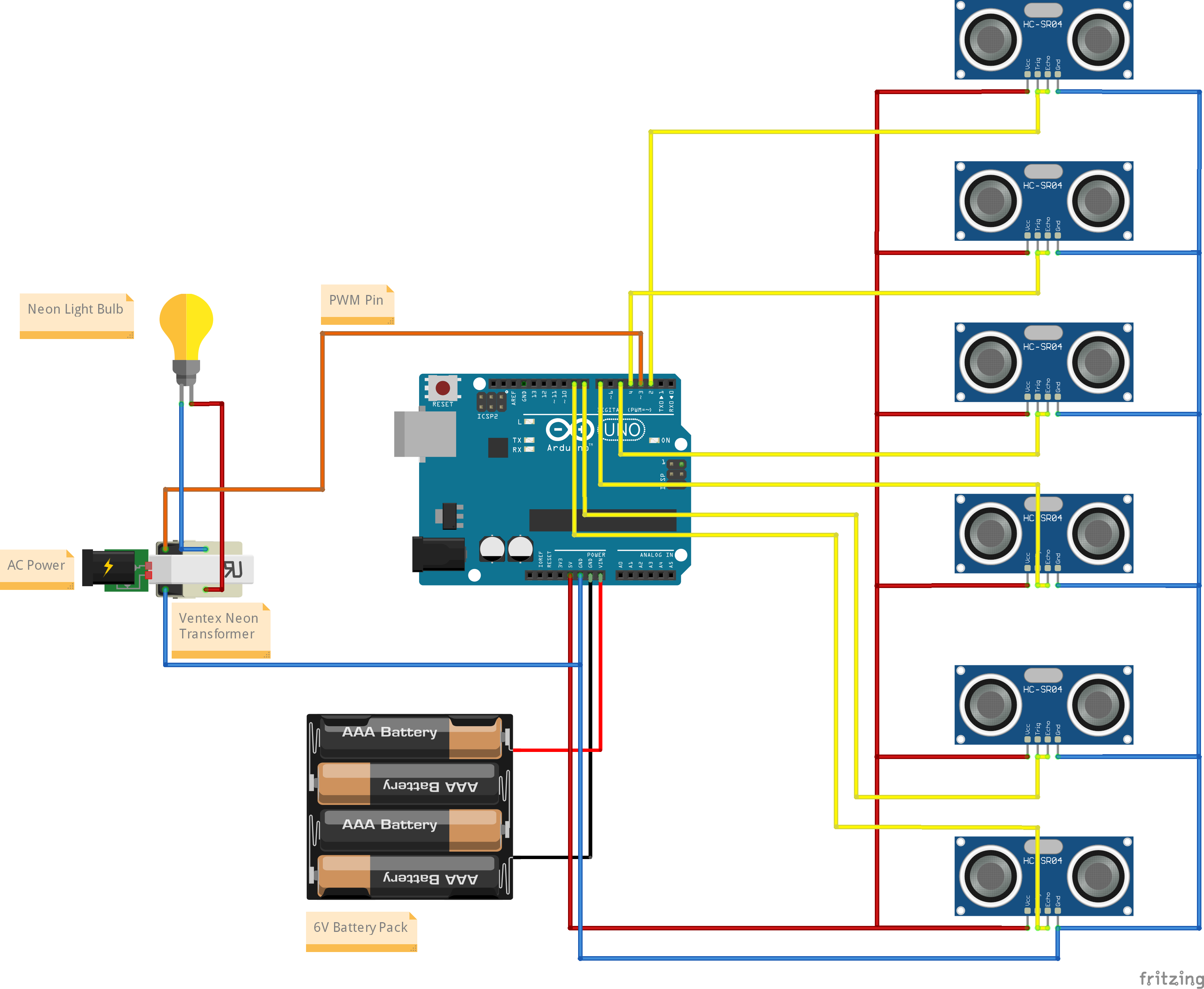 To ensure detection from all directions, six ultrasonic sensors are positioned around the setup. The system compares data from each sensor to determine the minimum value, representing the closest object. This value controls the PWM signal through a transformer, adjusting the neon light's brightness.
